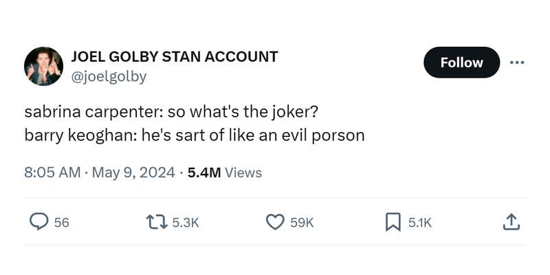 A late runner for one of Twitter's all-timers. I still miss what peak Twitter was like years ago and seeing tweets like this, I sometimes wonder if there's life yet left on the platform. Friends still active there tell me there isn't, so, so much for that I guess. But especially given Sabrina Carpenter's generational run on pop this year, I couldn't stop thinking about this one. Barry, you fucking idiot.